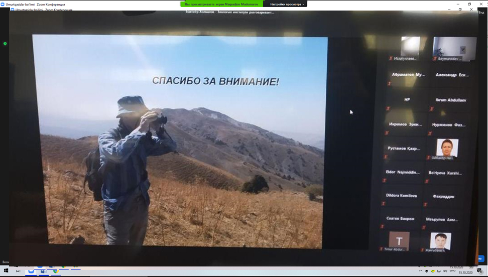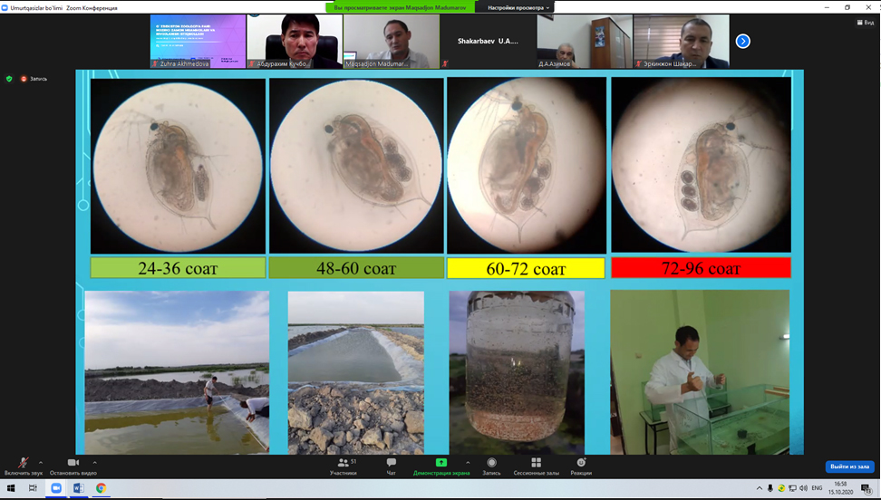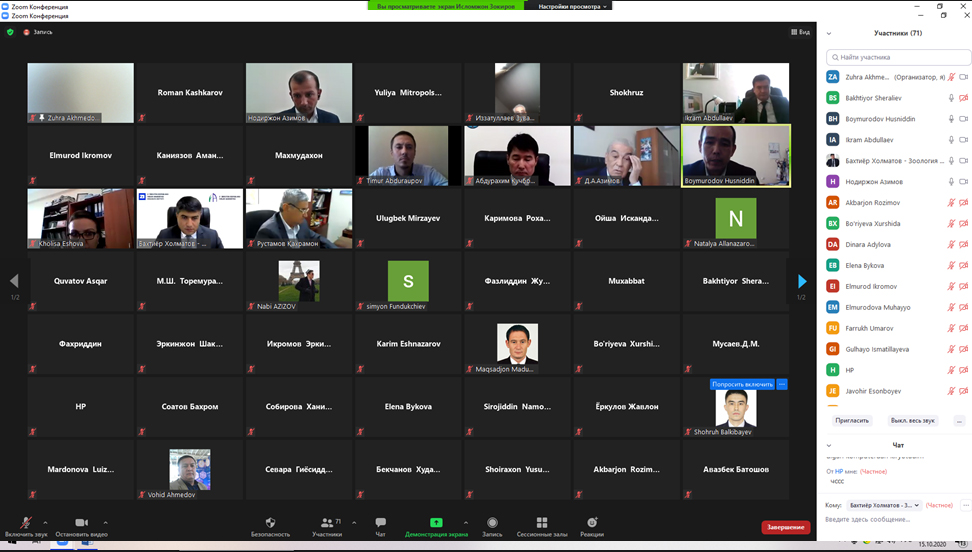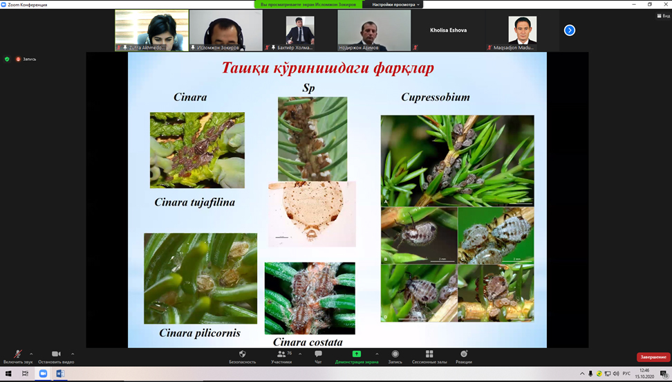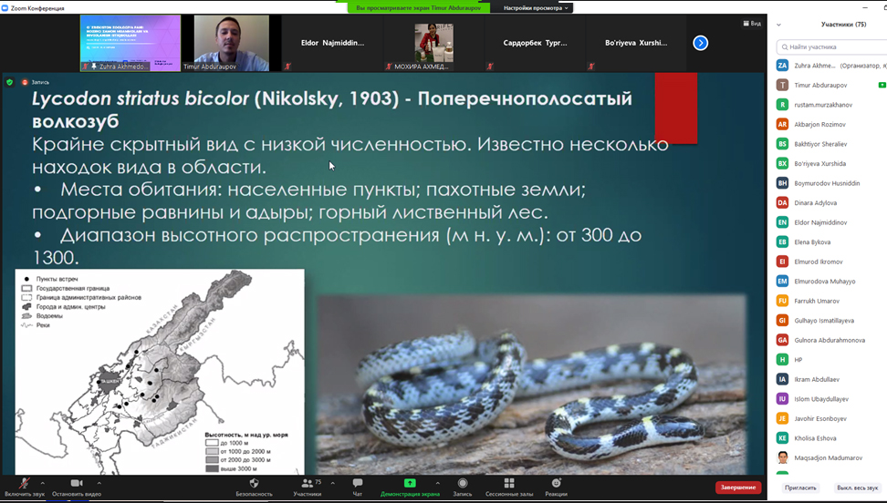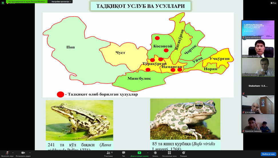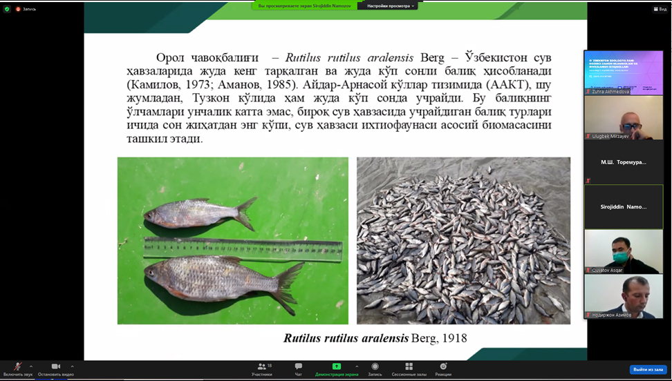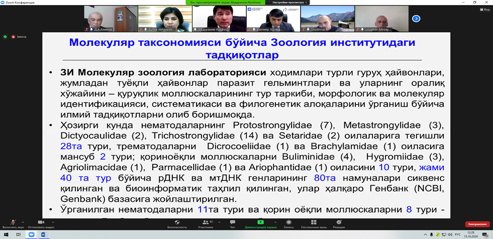 Фаннинг ҳозирги долзарб муаммоларига қаратилган замонавий тадқиқот натижалари бўйича: Хитой Халқ Республикаси Жанубий-ғарбий университети таянч докторанти, Мирзо Улуғбек номидаги Ўзбекистон Миллий университети таянч-докторант ва магистрантлари ҳамда барча Зоология институти ёш олимлари фаол иштирок этишди.